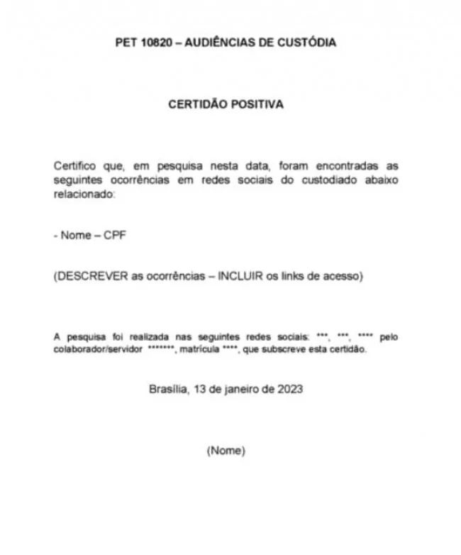 Esses documentos não eram públicos, muito menos compartilhados com as defesas dos investigados. Embora citassem processos do STF, eles jamais deveriam ter sido usados como base para decisões judiciais sem transparência. Um modelo de “certidão positiva” enviado por Kusahara para coordenar os trabalhos da equipe expõe o conteúdo vago e subjetivo, baseado exclusivamente em “ocorrências em redes sociais”.