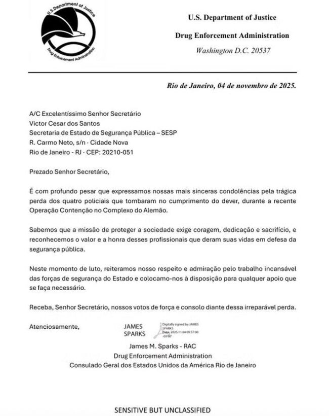 Documento do Departamento de Justiça dos EUA presta condolências às famílias dos agentes mortos em operação no Alemão e se coloca à disposição da gestão de Cláudio Castro para colaborar no combate ao tráfico.
