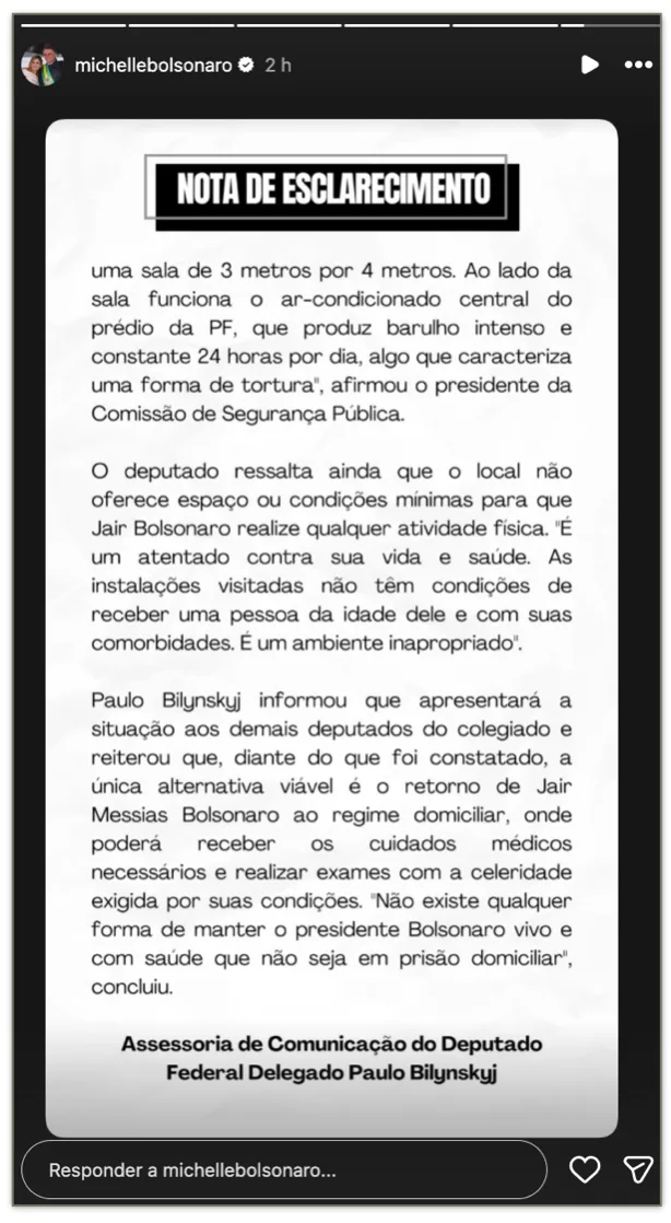 A ex-primeira-dama Michelle Bolsonaro publicou nesta quinta-feira (11) um comunicado relacionado à visita do deputado federal Paulo Bilynskyj (PL-SP) à cela onde o ex-presidente Jair Bolsonaro está detido em uma unidade da Polícia Federal. A nota foi divulgada após o parlamentar relatar as condições do local e afirmar que Bolsonaro estaria submetido a um regime semelhante ao de solitária.